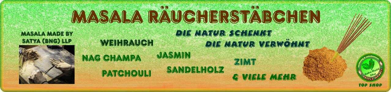 Eine alte Methode der Räucherstäbchenherstellung, die ihren Ursprung in Indien hat, ist bekannt unter dem Begriff Masala, was soviel wie Gewürz oder Gewürzpaste bedeutet. Der Herstellungsprozess umfasst das Stoßen und Auspressen vieler Kräuter, feiner Harze wie Kopal und Bernstein, aromatische Hölzer wie Zeder und Sandelholz, sowie einer Vielzahl an Gewürzen. Alle Zutaten werden pulverisiert und mit hochwertigen ätherischen Ölen und natürlicher Kautschukmasse vermischt und zu einer Masala Paste verarbeitet. Diese Paste wird traditionell von Hand auf ein Bambusstöckchen zu Masala Räucherstäbchen gerollt.